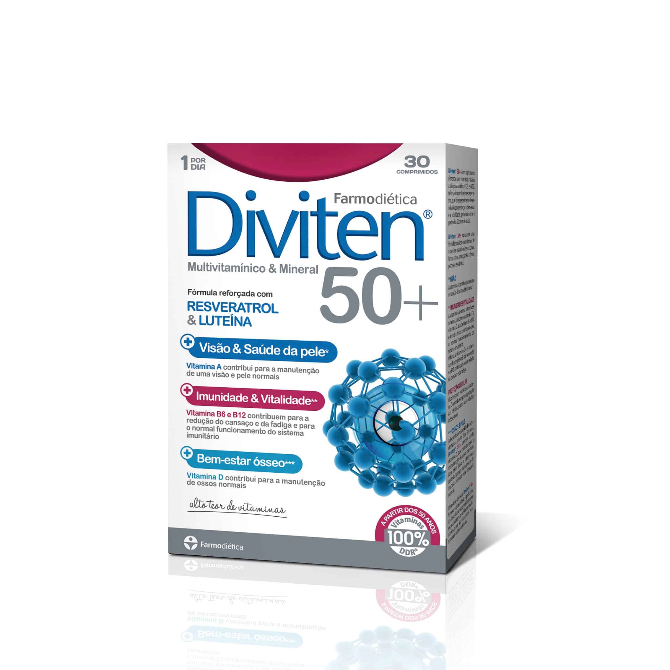 Diviten® 50+ é um suplemento alimentar com vitaminas, minerais, FOS e GOS, reforçado com luteína e resveratrol, que foi especialmente desenvolvido para reforçar o bem-estar e a vitalidade, principalmente a partir dos 50 anos de idade.
