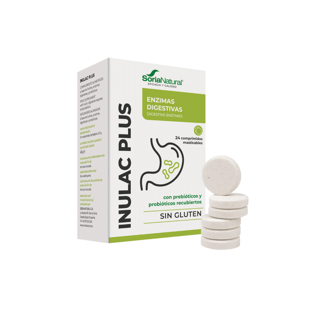 Inulac Plus Tablets Soria Natural é um produto altamente potente e eficaz que por um lado favorece a digestão dos alimentos graças à enzimas digestivas como a pancreatina (ajuda a digerir hidratos de carbono, proteínas e gorduras), a papaína e a amílase.